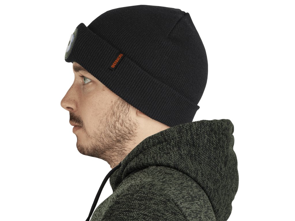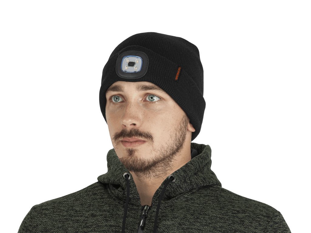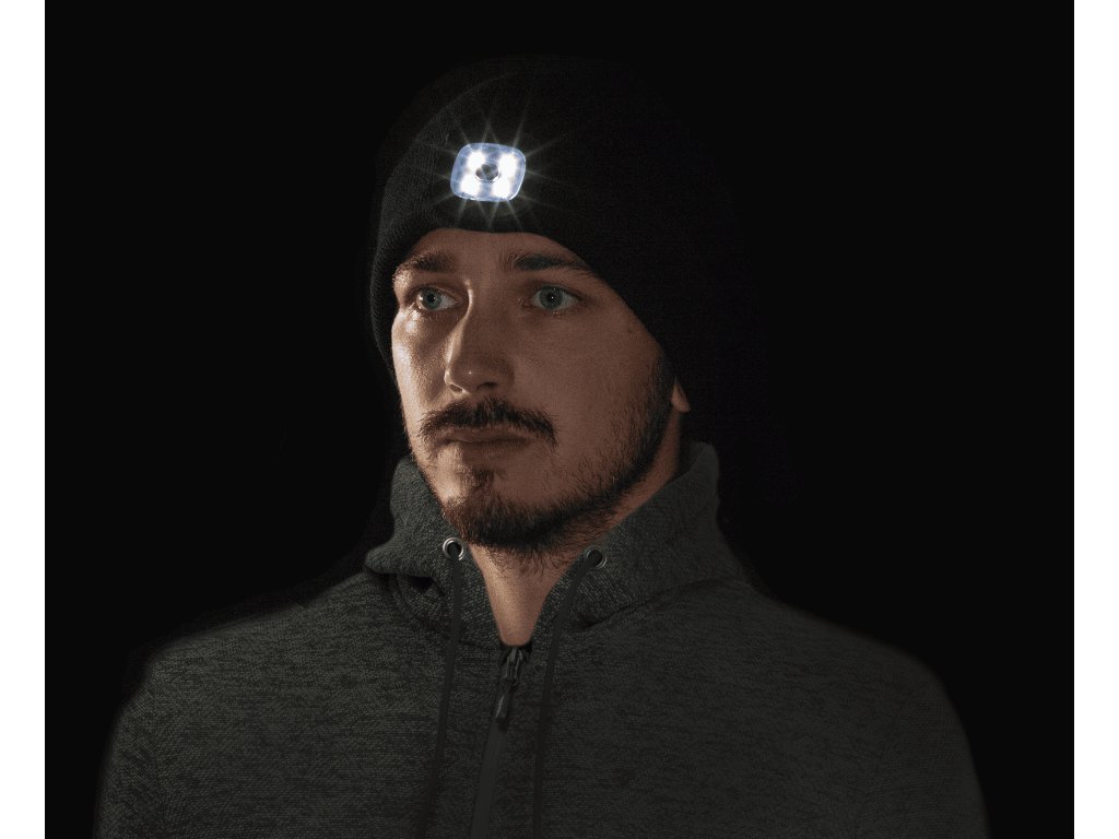 Praktická čepice se zabudovaným LED světlem vhodná pro práci venku i jiné večerní aktivity v chladném počasí.