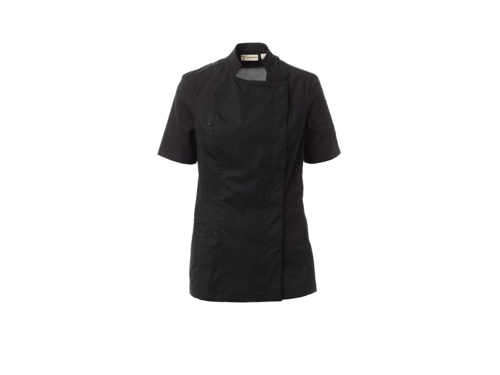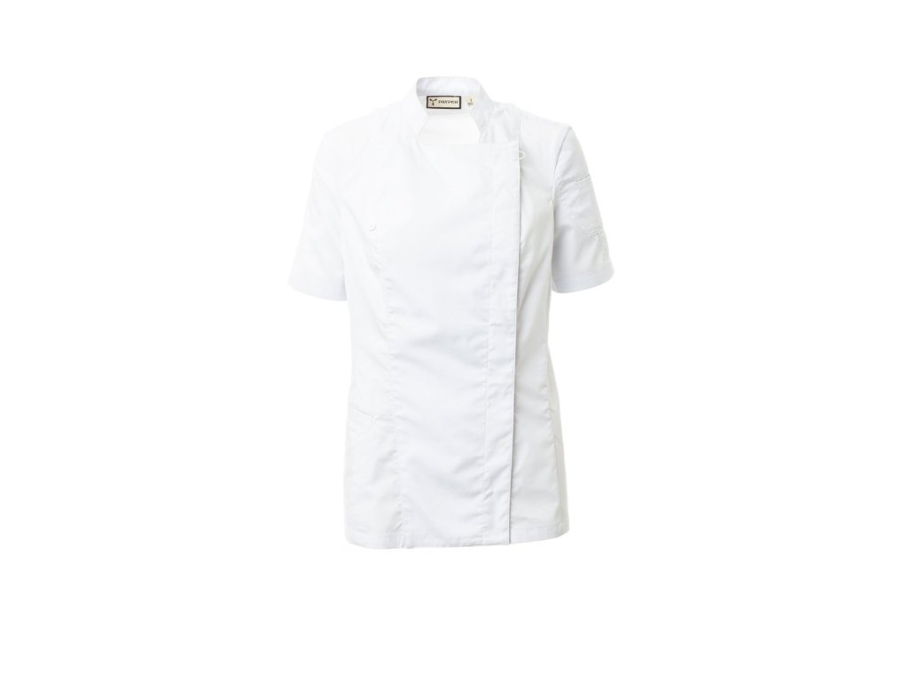 Dámský kuchařský rondon se stojáčkem, z bavlněného ripstopu a Lycry ® T400 ®, s vynikajícími elastickými a prodyšnými vlastnostmi, s pohodlnou síťovinou na zádech pro zvýšení prodyšnosti. Dvouřadé zapínání na patentky, klopa, kterou lze přeložit a připevnit ke hrudi pomocí zapínání na nezakrytý knoflík, a vytvořit tak efekt klopy na míru a inovativní výstřih do V. Krátké rukávy s lemem. Ikonická tvarovaná nášivka na levém rameni, s výšivkou vrtule tón v tónu, doplněná kapsičkou na pero. Praktická kapsa na smartphone v pase.