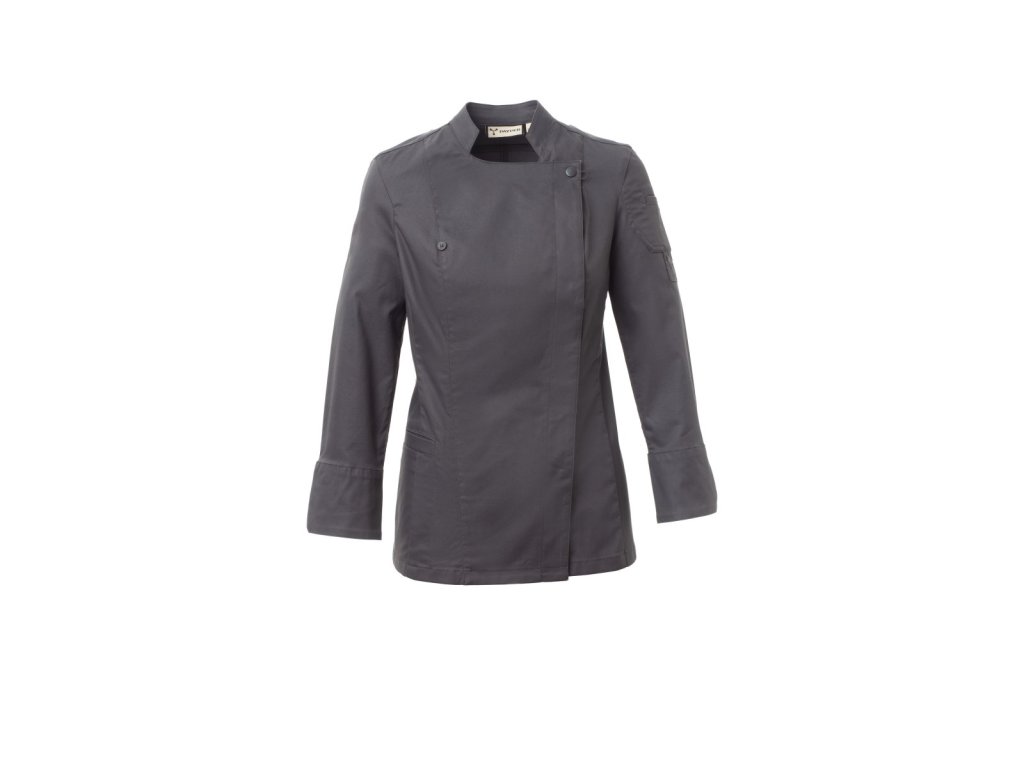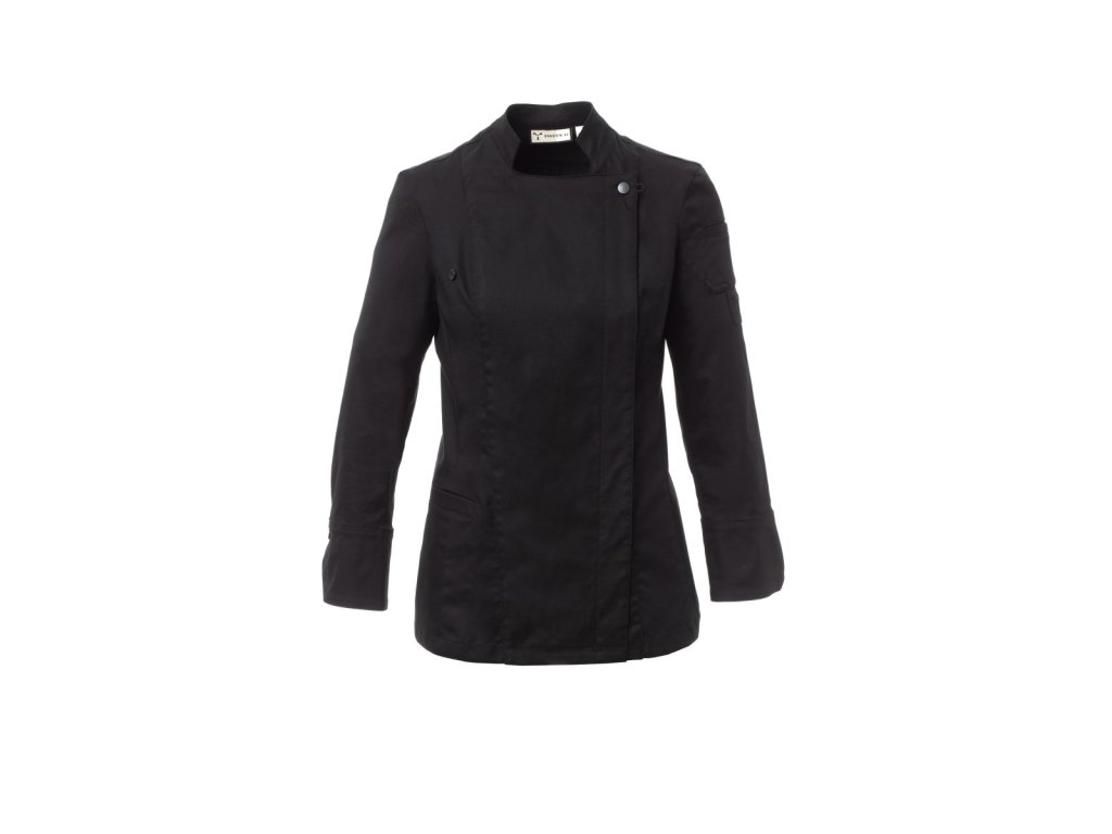 Dámský kuchařský rondon se stojáčkem, z bavlněného kepru a Lycry ® T400 ®, s vynikajícími elastickými a prodyšnými vlastnostmi. Dvouřadé zapínání na patentky, klopa, kterou lze přeložit a připevnit ke hrudi pomocí zapínání na nezakrytý knoflík, a vytvořit tak efekt klopy na míru a inovativní výstřih do V. Dlouhé rukávy s manžetou se zapínáním na nezakrytou patentku. Ikonická tvarovaná nášivka na levém rameni, s výšivkou vrtule tón v tónu, doplněná kapsičkou na pero. Praktická kapsa na smartphone v pase. Svislé rozparky v dolní části zad pro usnadnění pohybu.