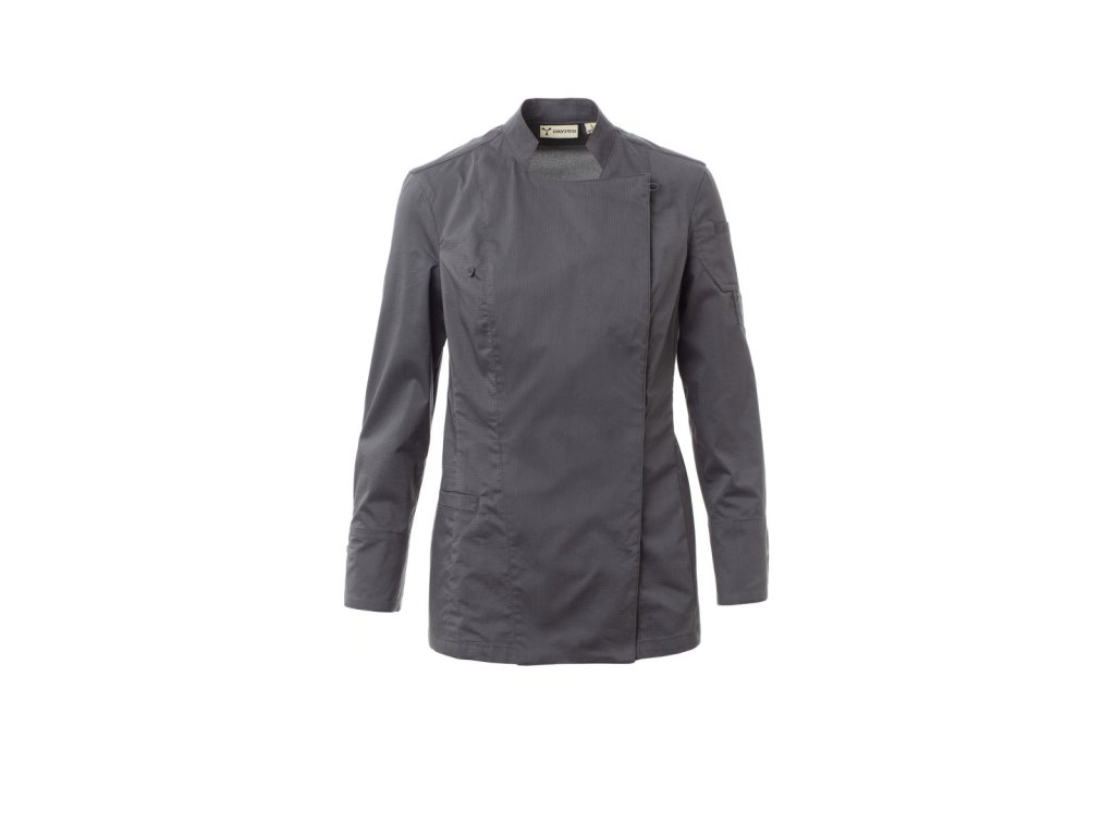 Dámský kuchařský rondon se stojáčkem, z bavlněného ripstopu a Lycry ® T400 ®, s vynikajícími elastickými a prodyšnými vlastnostmi, s pohodlnou síťovinou na zádech a v podpaží pro zvýšení prodyšnosti. Dvouřadé zapínání na patentky, klopa, kterou lze přeložit a připevnit ke hrudi pomocí zapínání na nezakrytý knoflík, a vytvořit tak efekt klopy na míru a inovativní výstřih do V. Dlouhé rukávy s košilovou manžetou se zapínáním na nezakrytou patentku. Ikonická tvarovaná nášivka na levém rameni, s výšivkou vrtule tón v tónu, doplněná kapsičkou na pero. Praktická kapsa na smartphone v pase.
