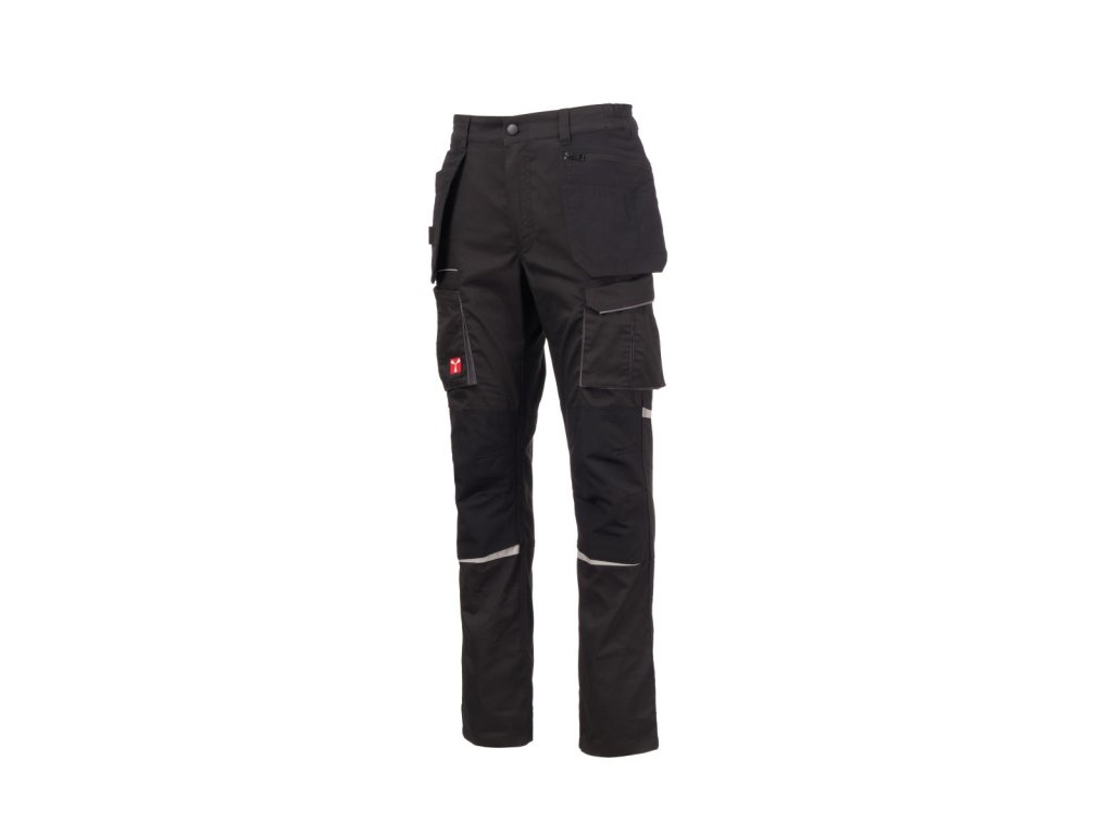 - Na zadní straně je kapsa s klopou na suchý zip (levá nohavice); otevřená kapsa se dvěma reflexními páskami a kapsička na svinovací metr (pravá nohavice); reflexní vložky ve výšce kolen a patní chrániče z kontrastní látky pro obě nohavice