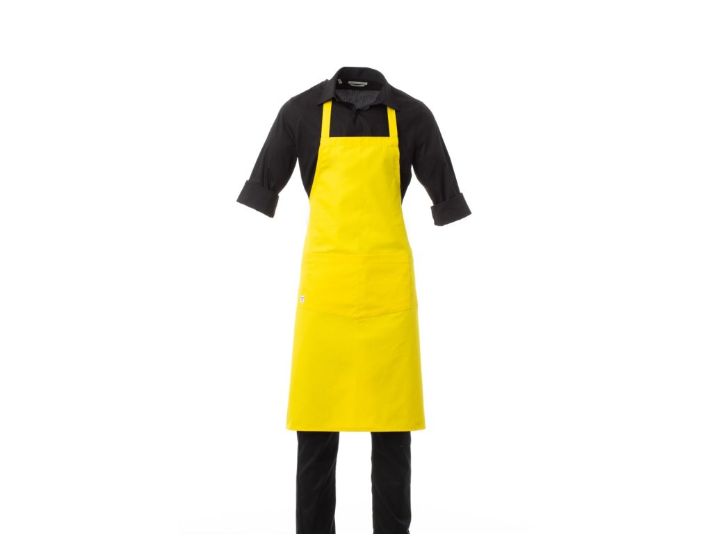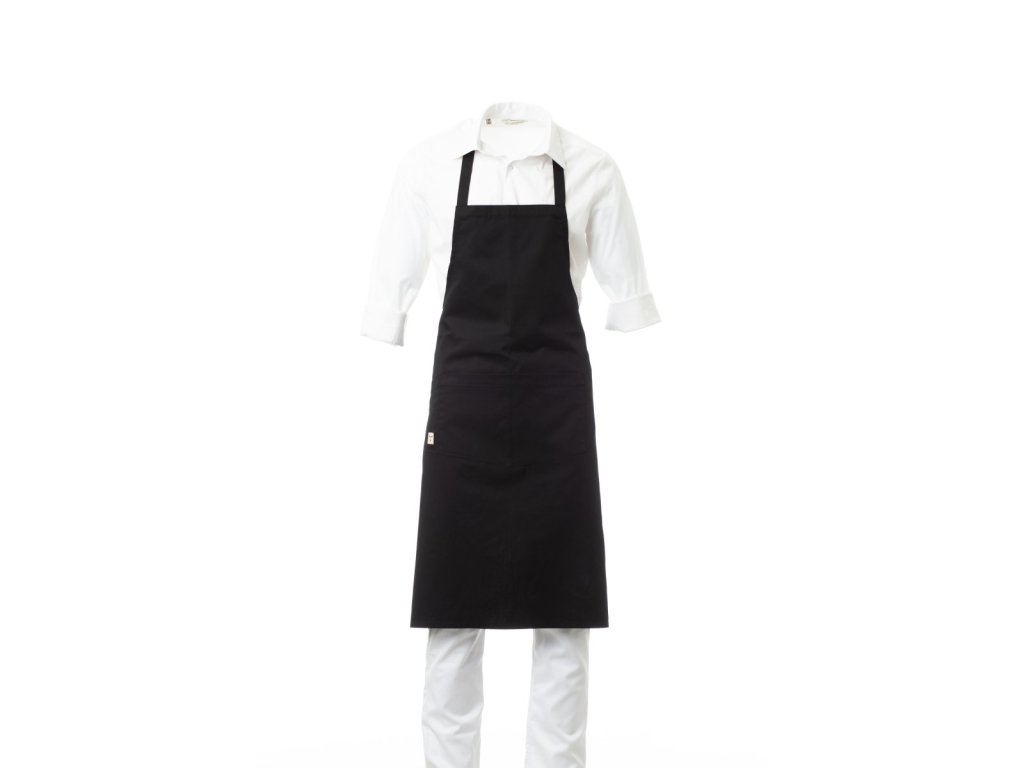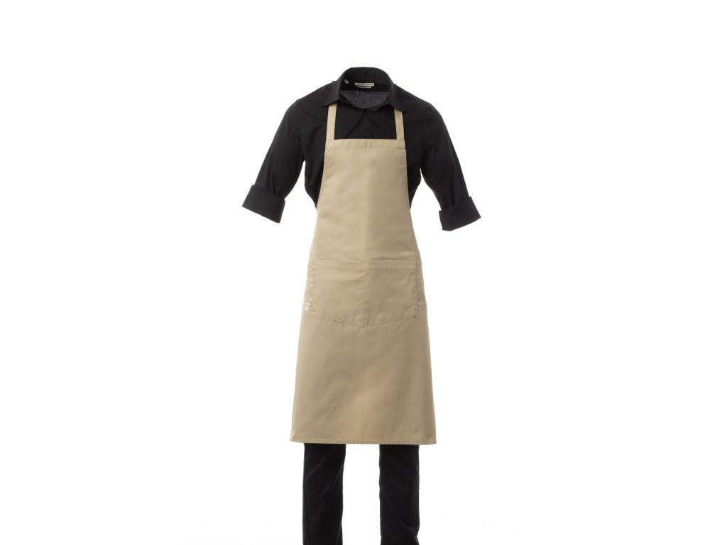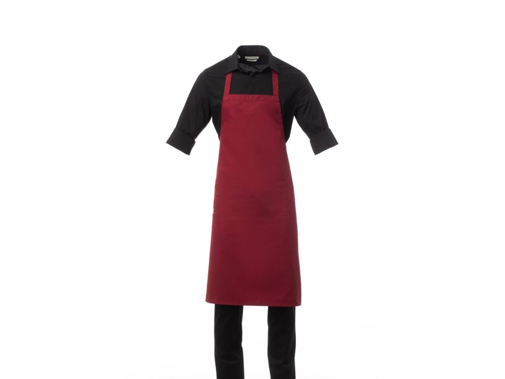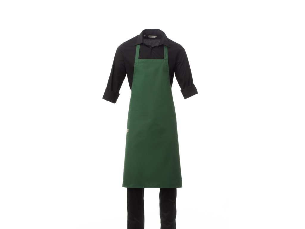 Zástěra unisex, multifunkční, s nenastavitelným laclem, z polybavlněné tkaniny. Kapsa uprostřed je rozdělená na 2 části a vedle ní je praktická kapsička na drobné předměty.