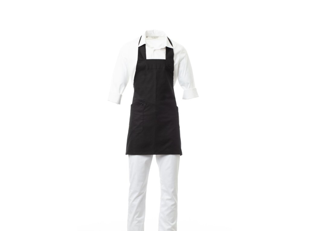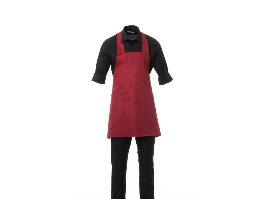 Zástěra unisex, multifunkční, s nastavitelným laclem pomocí 2 knoflíků na zadní straně krku, z bavlněného kepru a Lycry ® T400 ®, s vynikajícími elastickými a prodyšnými vlastnostmi. Má jednu kapsičku na drobné předměty a jednu objemnější kapsu ozdobenou knoflíkem.