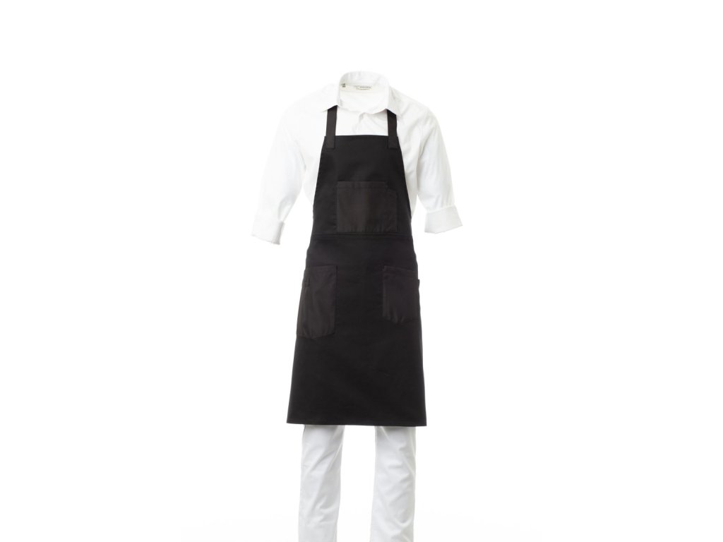 Zástěra unisex, multifunkční, s nastavitelným laclem pomocí knoflíků na zadní straně krku, z bavlněného kepru a Lycry ® T400 ®, s vynikajícími elastickými a prodyšnými vlastnostmi. Má jednu kapsu na hrudi a dvě v pase, s různými přihrádkami a poutky na utěrku. Všechny kapsy jsou z Nylon Oxford 500D.