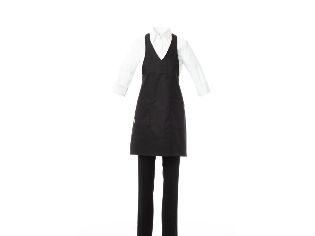 Zástěra unisex, multifunkční, s laclem se zaobleným výstřihem do V, nastavitelná pomocí 2 knoflíků na zadní straně krku, z bavlněného kepru a Lycry ® T400 ®, s vynikajícími elastickými a prodyšnými vlastnostmi. Má jednu kapsičku na drobné předměty na straně srdce a dvě našité kapsy v pase.
