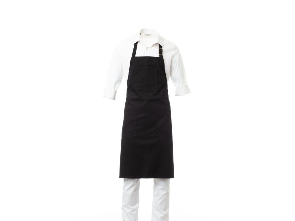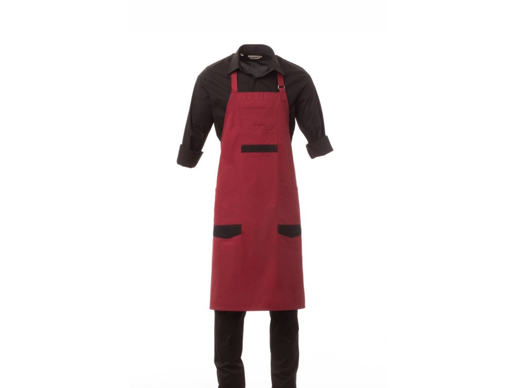 Zástěra unisex, multifunkční, s nastavitelným laclem pomocí přezky, z polybavlněné tkaniny. Má kapsu na hrudi s tvarovanou nášivkou a dvě kapsy v pase, z nichž jedna je vybavena poutkem na pero. Výztužné aplikace na dně kapes v kontrastních barvách s výjimkou u černé barvy.