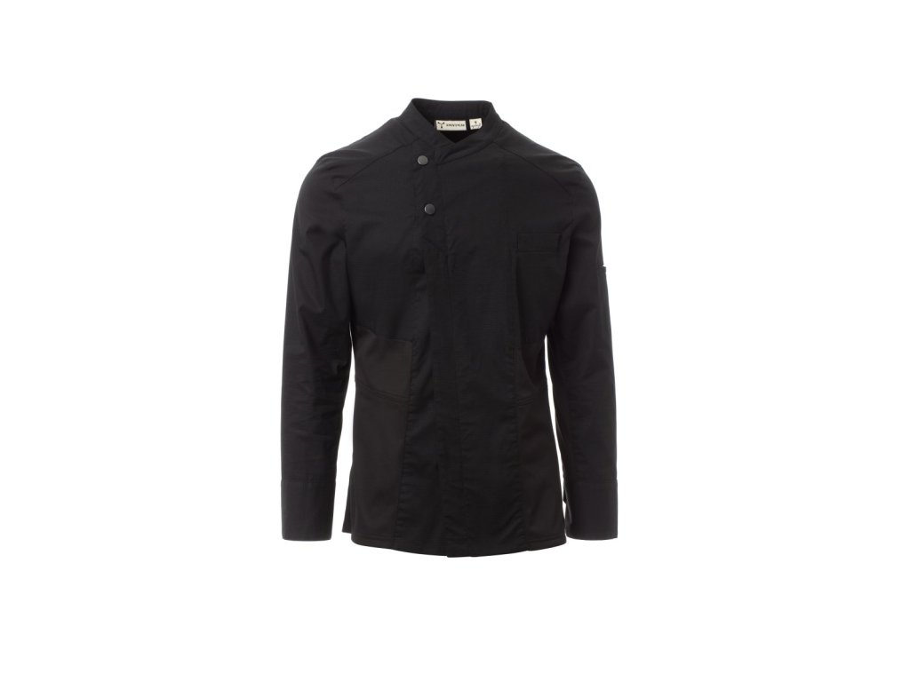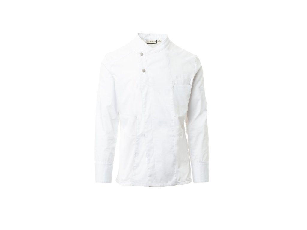 Pánský kuchařský rondon s šálovým límcem, z bavlněného ripstopu a Lycry ® T400 ®, s vynikajícími elastickými a prodyšnými vlastnostmi, s pohodlnou síťovinou na zádech, v podpaží, průramkách a na bocích pro zvýšení prodyšnosti. Dvouřadé zapínání na patentky. Dlouhé rukávy s košilovou manžetou se zapínáním na nezakrytou patentku. Ikonická tvarovaná nášivka v horní části zad, s výšivkou vrtule tón v tónu. Kapsička na pero na levém rameni a kapsička na hrudi.