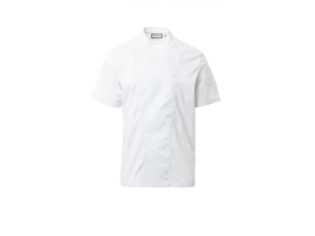 Pánský kuchařský rondon se stojáčkem, z bavlněného ripstopu a Lycry ® T400 ®, s vynikajícími elastickými a prodyšnými vlastnostmi, s pohodlnou síťovinou na zádech a v průramkách pro zvýšení prodyšnosti. Dvouřadé zapínání na patentky, klopa, kterou lze přeložit a připevnit ke hrudi pomocí zapínání na nezakrytý knoflík, a vytvořit tak efekt klopy na míru a inovativní výstřih do V. Krátké rukávy s lemem. Ikonická tvarovaná nášivka na levém rameni, s výšivkou vrtule tón v tónu, doplněná kapsičkou na pero. Praktická kapsa na smartphone v pase.