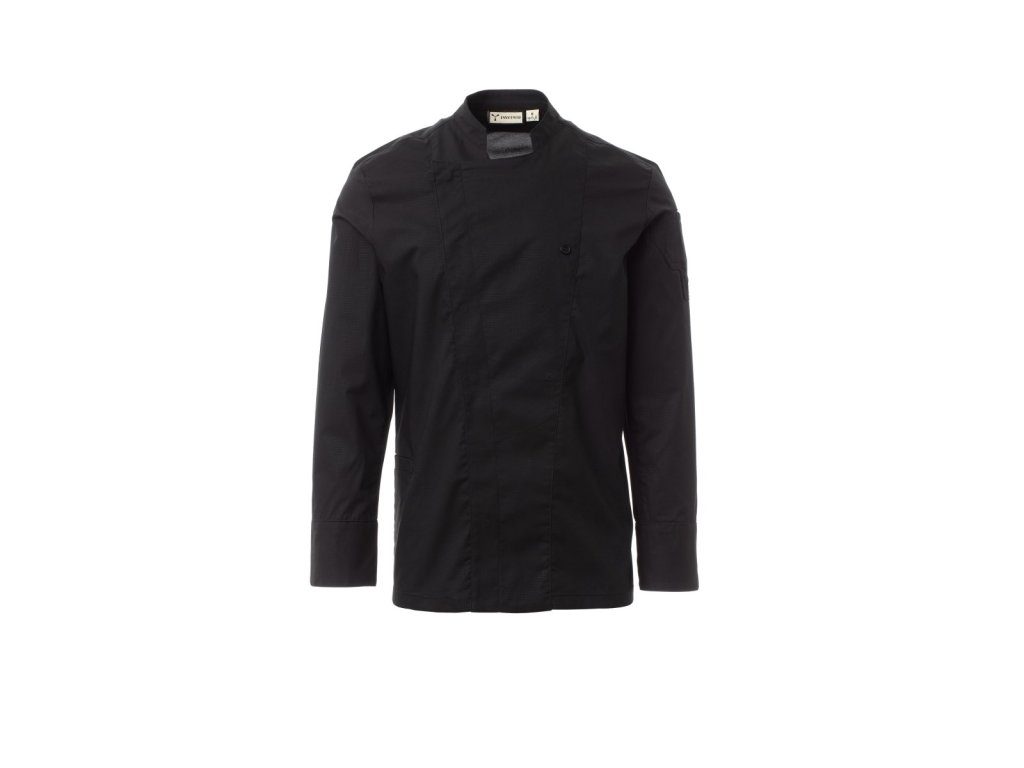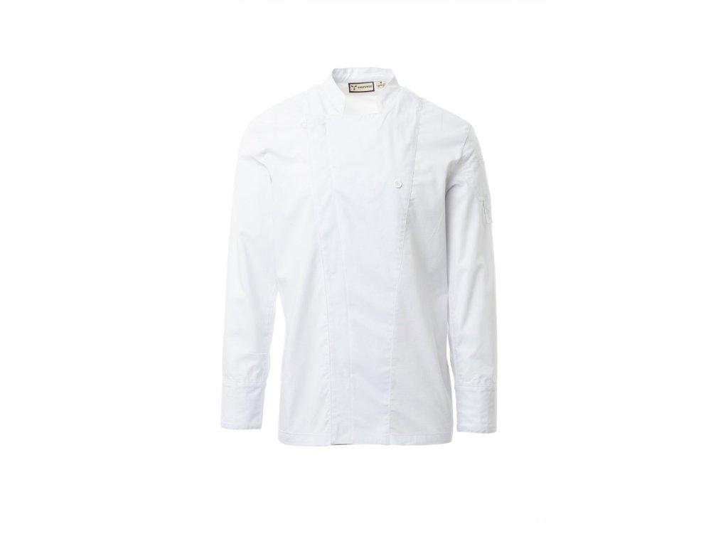 Pánský kuchařský rondon se stojáčkem, z bavlněného ripstopu a Lycry ® T400 ®, s vynikajícími elastickými a prodyšnými vlastnostmi, s pohodlnou síťovinou na zádech, v podpaží a v průramkách pro zvýšení prodyšnosti. Dvouřadé zapínání na patentky, klopa, kterou lze přeložit a připevnit ke hrudi pomocí zapínání na nezakrytý knoflík, a vytvořit tak efekt klopy na míru a inovativní výstřih do V. Dlouhé rukávy s košilovou manžetou se zapínáním na nezakrytou patentku. Ikonická tvarovaná nášivka na levém rameni, s výšivkou vrtule tón v tónu, doplněná kapsičkou na pero. Praktická kapsa na smartphone v pase.