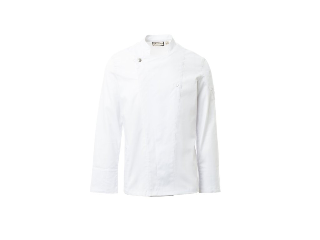 Pánský kuchařský rondon se stojáčkem, z bavlněného kepru a Lycry ® T400 ®, s vynikajícími elastickými a prodyšnými vlastnostmi. Dvouřadé zapínání na patentky, klopa, kterou lze přeložit a připevnit ke hrudi pomocí zapínání na nezakrytý knoflík, a vytvořit tak efekt klopy na míru a inovativní výstřih do V. Dlouhé rukávy s ohrnovací manžetou, luneta ze síťoviny v podpaží pro zvýšení prodyšnosti. Ikonická tvarovaná nášivka na levém rameni, s výšivkou vrtule tón v tónu, doplněná kapsičkou na pero. Praktická kapsa na smartphone v pase. Svislé rozparky v dolní části zad pro usnadnění pohybu.