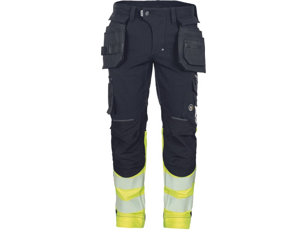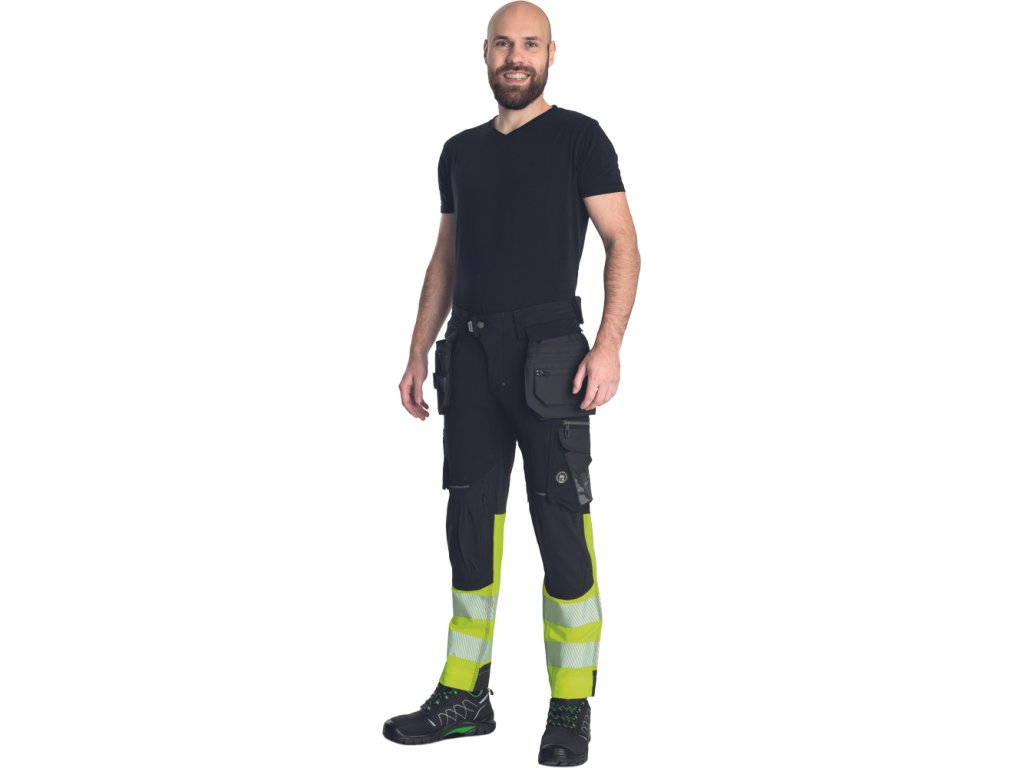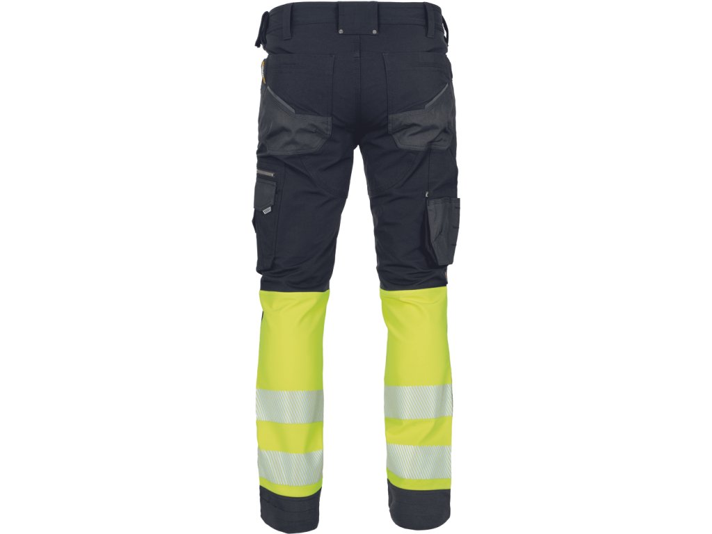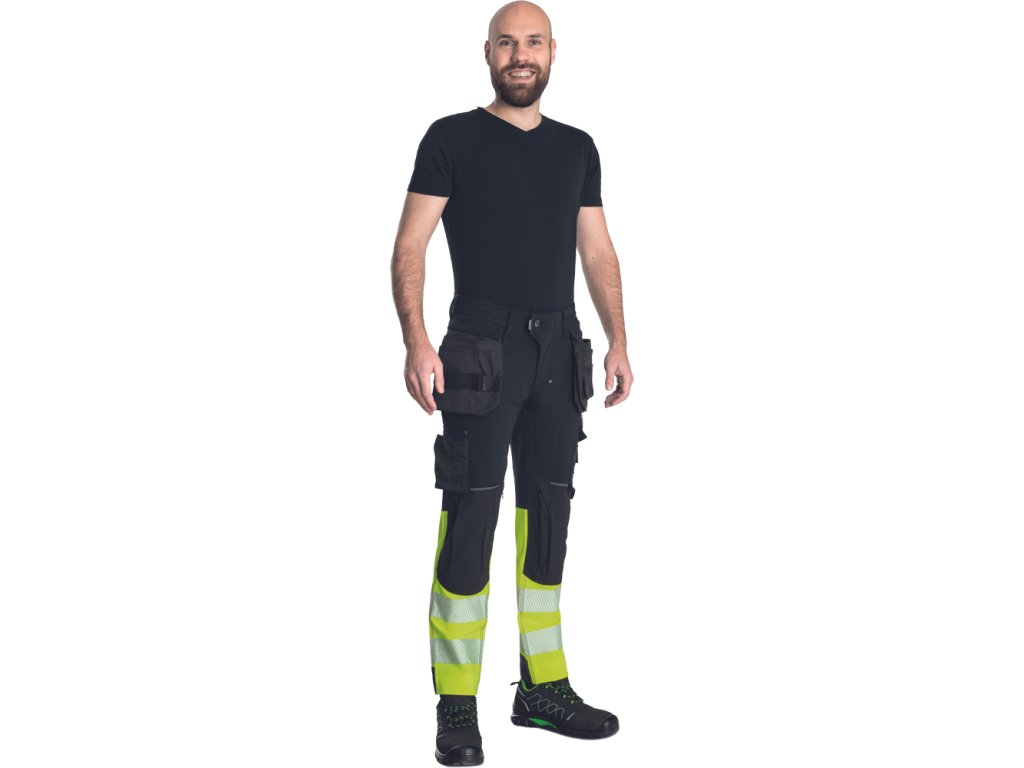 Pánské HI-VIS pracovní kalhoty s pružným pasem doplněné o 2 boční odepínatelné, multifunkční "létající" kapsy a 2 zadní kapsy se zapínáním na suchý zip. Dále pak o 2 multifunkční stehenní kapsy. Elastické inovativní materiály TRIFIBETEX PRO® a TRIFIBETEX VIS®. Odolné trojité prošití nohavic a sedu a CORDURA® zesílení v oblasti kolen s možností vkládání kolenních výztuh. 7,5 cm široké tištěné segmentované reflexní pruhy a reflexní prvky v barevném odstínu. Nastavitelná délka nohavic o 5 cm.